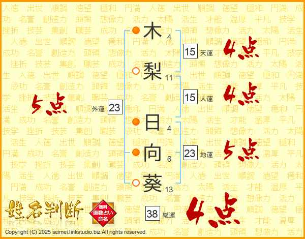 木梨日向葵さんの総運は38画の4点!