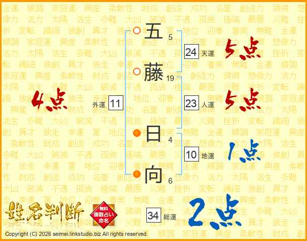 あなたの人生を表す1番重要な運勢です。生涯を通じて影響する総合運となり、主に50歳以降の晩年期に影響を及ぼします。苗字と名前の合計画数。