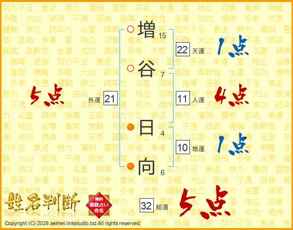 増(15画)谷(7画) 日(4画)向(6画)