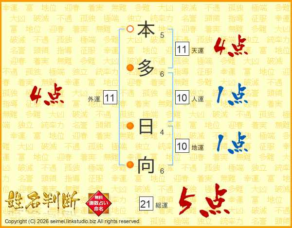本多日向さんの総運は21画の5点!