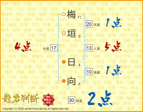 梅(11画)垣(9画) 日(4画)向(6画)