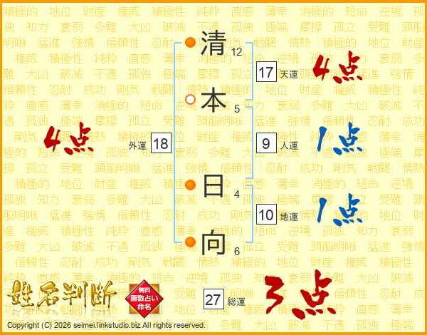 あなたの人生を表す1番重要な運勢です。生涯を通じて影響する総合運となり、主に50歳以降の晩年期に影響を及ぼします。苗字と名前の合計画数。