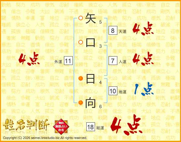 生活面を象徴する運勢です。外部から受ける影響力を表し、結婚運、家庭運や職場、環境への順応性を表します。総運から人運を引いた画数。姓や名が1文字の場合を除く。