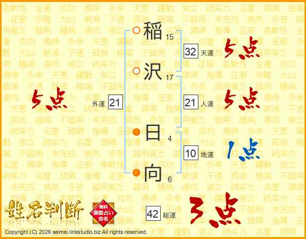 稲沢日向さんの天運は32画の5点!