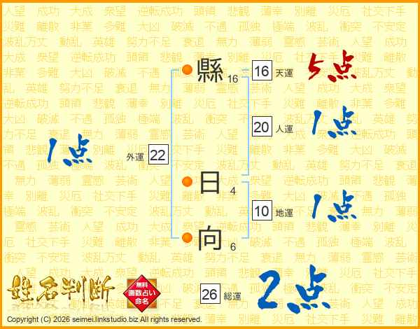 生活面を象徴する運勢です。外部から受ける影響力を表し、結婚運、家庭運や職場、環境への順応性を表します。総運から人運を引いた画数。姓や名が1文字の場合を除く。