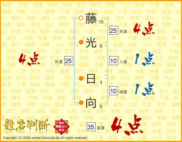 家系が持つ宿命的な運勢を表します。祖先から受け継いだ苗字ですので自分の力が及びません。家柄を象徴します。苗字の合計画数。