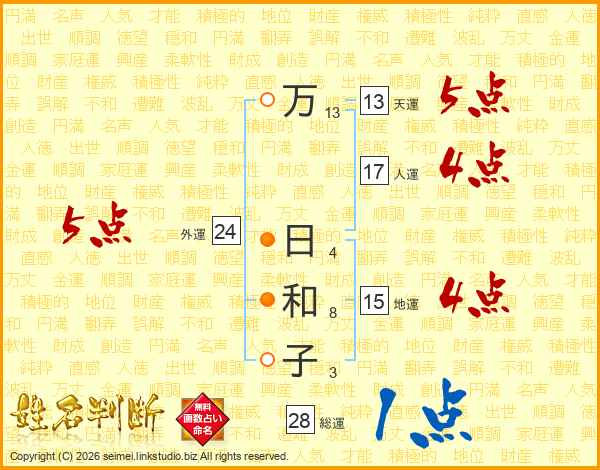 万(13画) 日(4画)和(8画)子(3画)