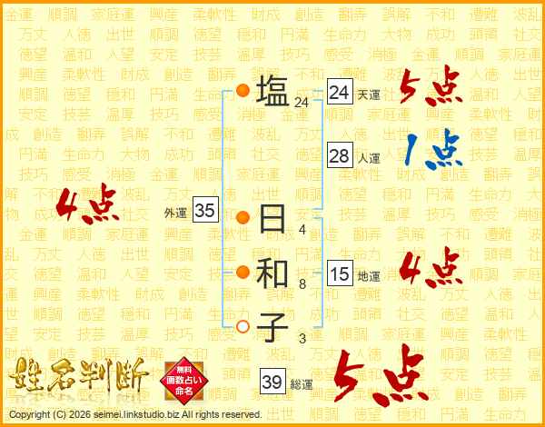 塩(24画) 日(4画)和(8画)子(3画)