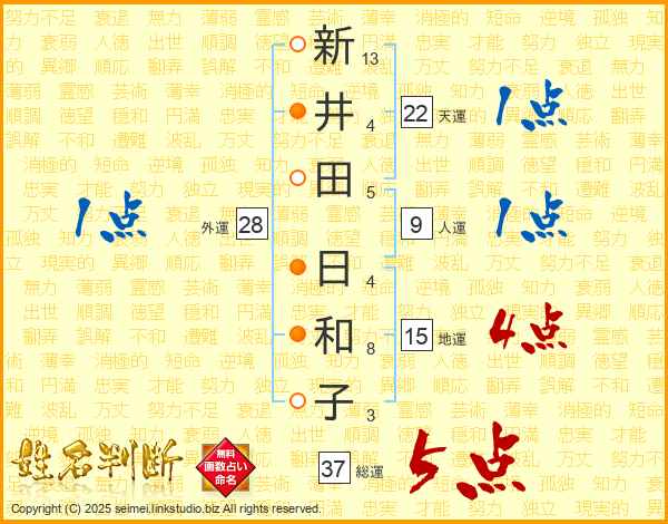 新(13画)井(4画)田(5画) 日(4画)和(8画)子(3画)