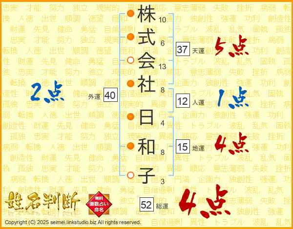 株(10画)式(6画)会(13画)社(8画) 日(4画)和(8画)子(3画)