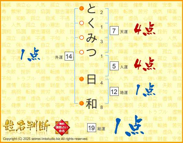 生活面を象徴する運勢です。外部から受ける影響力を表し、結婚運、家庭運や職場、環境への順応性を表します。総運から人運を引いた画数。姓や名が1文字の場合を除く。