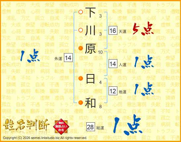 生活面を象徴する運勢です。外部から受ける影響力を表し、結婚運、家庭運や職場、環境への順応性を表します。総運から人運を引いた画数。姓や名が1文字の場合を除く。