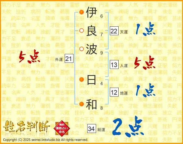 伊(6画)良(7画)波(9画) 日(4画)和(8画)