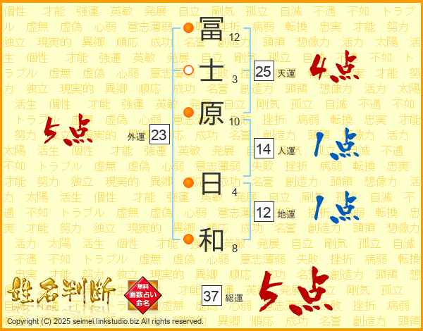 冨(12画)士(3画)原(10画) 日(4画)和(8画)
