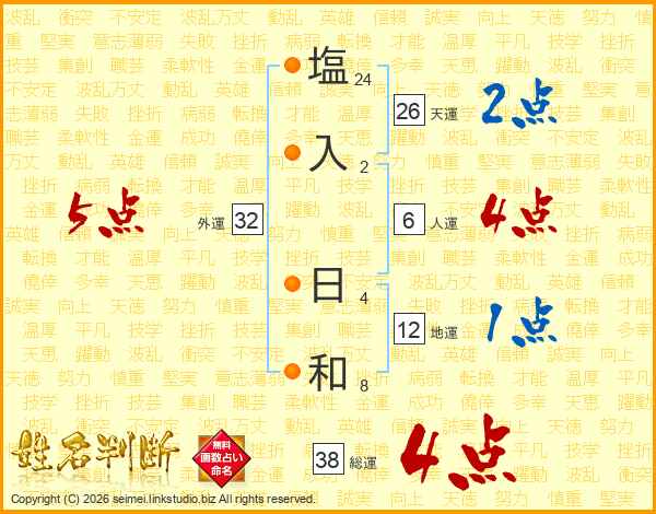 生活面を象徴する運勢です。外部から受ける影響力を表し、結婚運、家庭運や職場、環境への順応性を表します。総運から人運を引いた画数。姓や名が1文字の場合を除く。