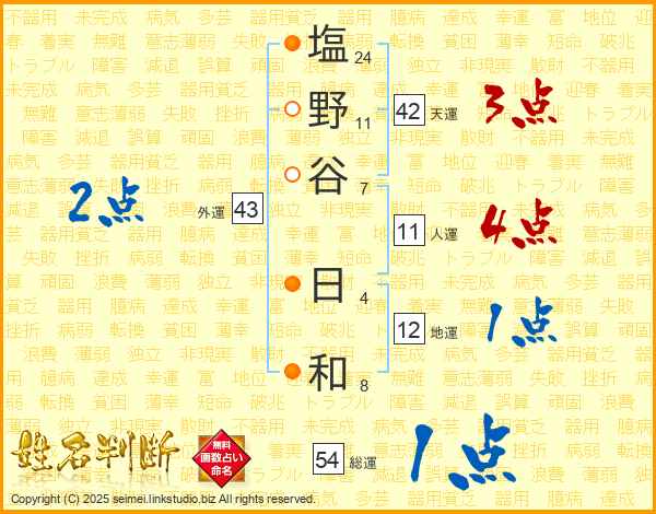 塩(24画)野(11画)谷(7画) 日(4画)和(8画)