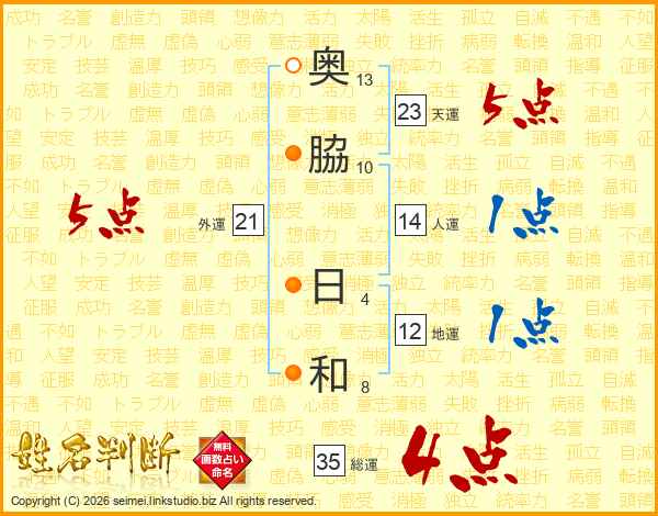 生活面を象徴する運勢です。外部から受ける影響力を表し、結婚運、家庭運や職場、環境への順応性を表します。総運から人運を引いた画数。姓や名が1文字の場合を除く。
