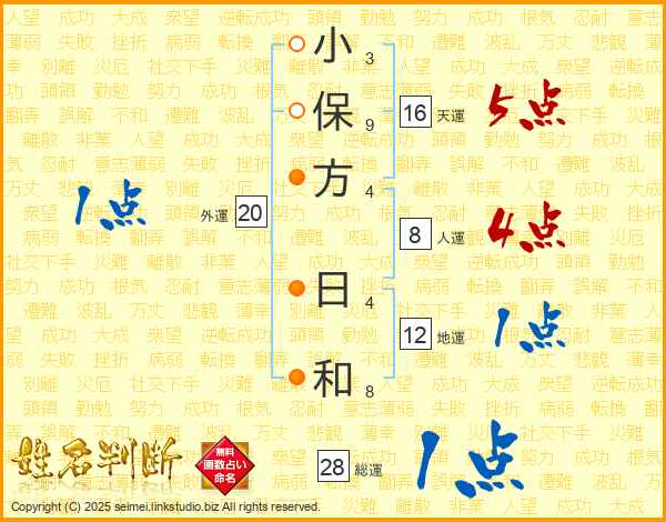 生活面を象徴する運勢です。外部から受ける影響力を表し、結婚運、家庭運や職場、環境への順応性を表します。総運から人運を引いた画数。姓や名が1文字の場合を除く。