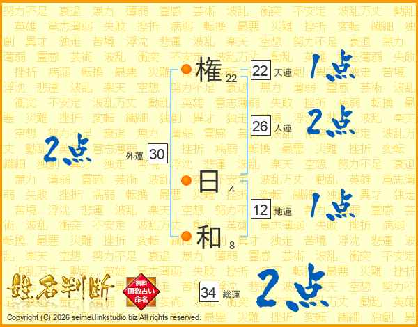 生活面を象徴する運勢です。外部から受ける影響力を表し、結婚運、家庭運や職場、環境への順応性を表します。総運から人運を引いた画数。姓や名が1文字の場合を除く。