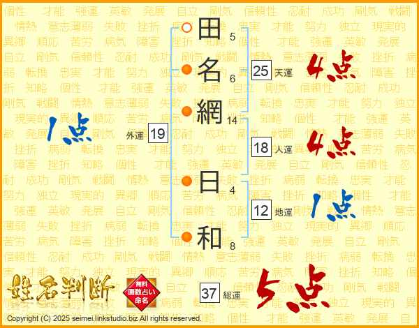 田(5画)名(6画)網(14画) 日(4画)和(8画)