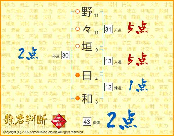 野々垣日和さんの総運は43画の2点!