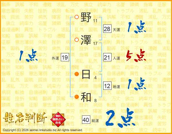 野(11画)澤(17画) 日(4画)和(8画)