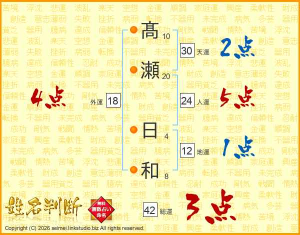 髙(10画)瀬(20画) 日(4画)和(8画)