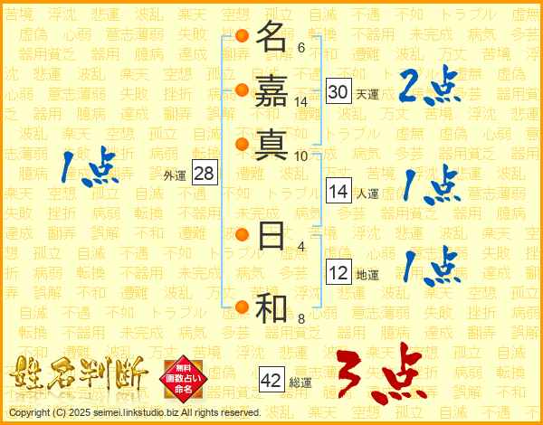 名(6画)嘉(14画)真(10画) 日(4画)和(8画)