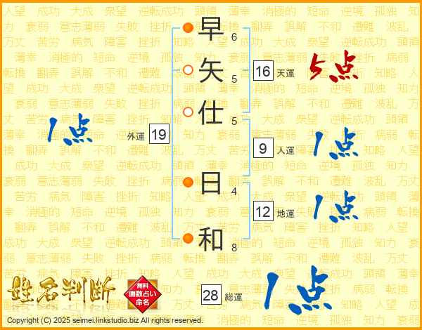 生活面を象徴する運勢です。外部から受ける影響力を表し、結婚運、家庭運や職場、環境への順応性を表します。総運から人運を引いた画数。姓や名が1文字の場合を除く。