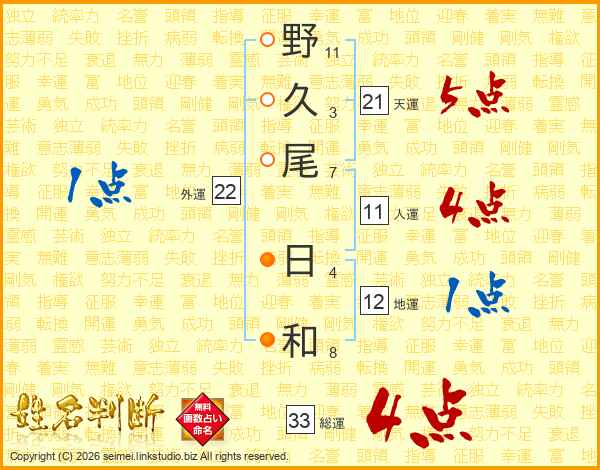 野久尾日和さんの総運は33画の4点!