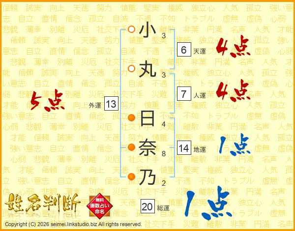 小(3画)丸(3画) 日(4画)奈(8画)乃(2画)