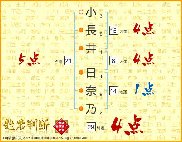 小(3画)長(8画)井(4画) 日(4画)奈(8画)乃(2画)