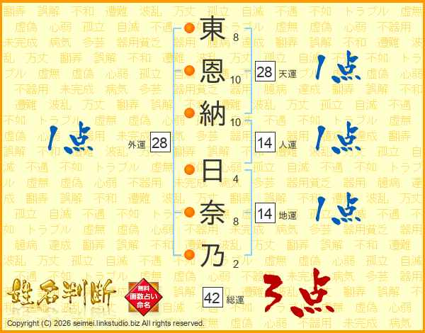 東(8画)恩(10画)納(10画) 日(4画)奈(8画)乃(2画)