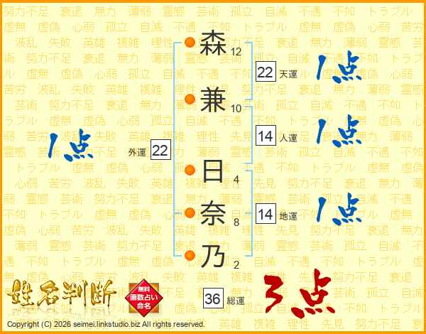 森(12画)兼(10画) 日(4画)奈(8画)乃(2画)