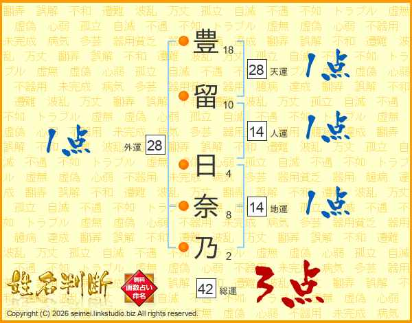 豊(18画)留(10画) 日(4画)奈(8画)乃(2画)