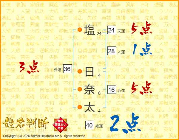 塩(24画) 日(4画)奈(8画)太(4画)