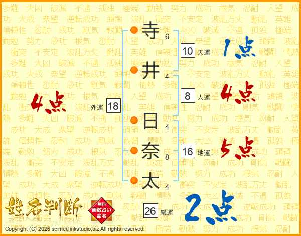寺(6画)井(4画) 日(4画)奈(8画)太(4画)