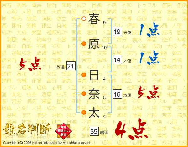 春(9画)原(10画) 日(4画)奈(8画)太(4画)