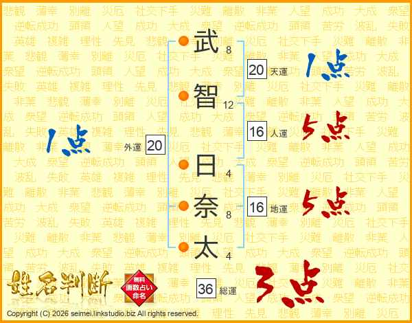 武(8画)智(12画) 日(4画)奈(8画)太(4画)
