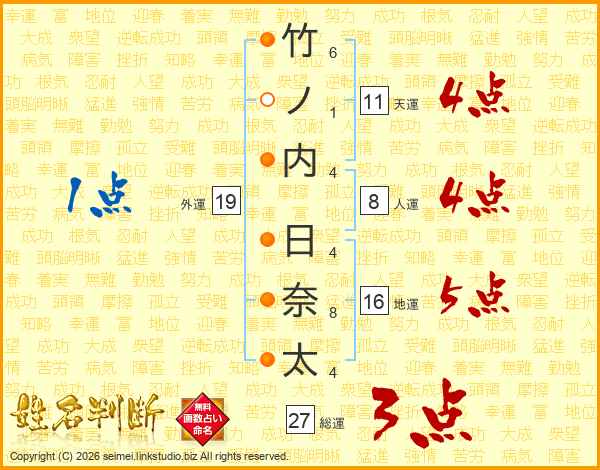 竹ノ内日奈太さんの天運は11画の4点!