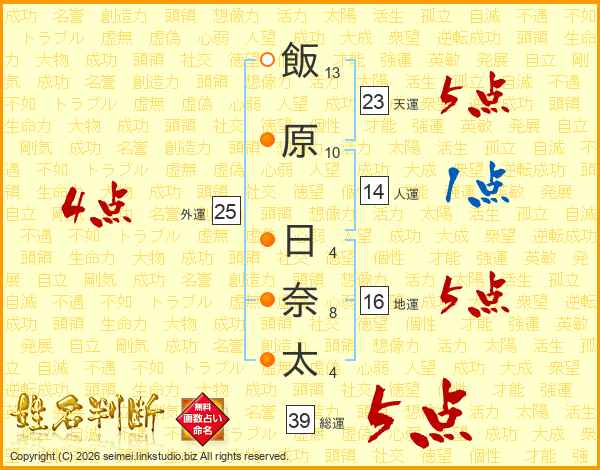 飯(13画)原(10画) 日(4画)奈(8画)太(4画)
