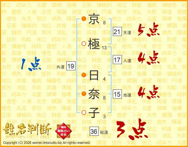 京(8画)極(13画) 日(4画)奈(8画)子(3画)