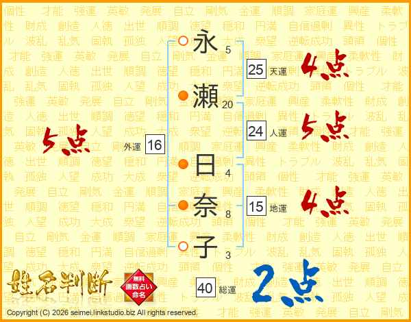 永(5画)瀬(20画) 日(4画)奈(8画)子(3画)