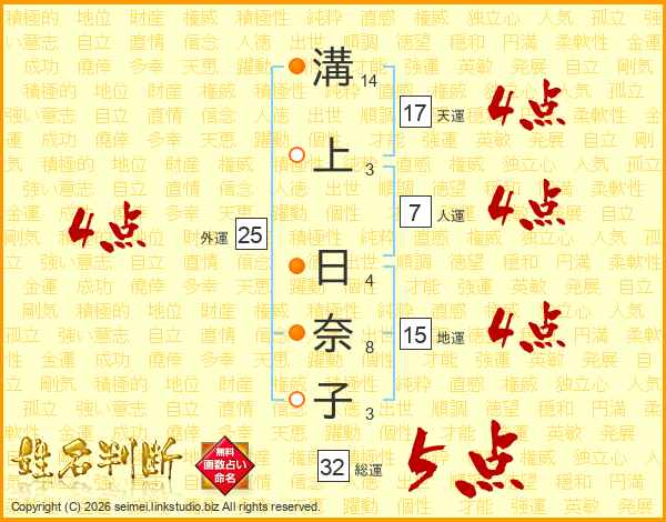 溝(14画)上(3画) 日(4画)奈(8画)子(3画)