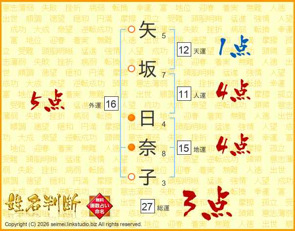 矢(5画)坂(7画) 日(4画)奈(8画)子(3画)