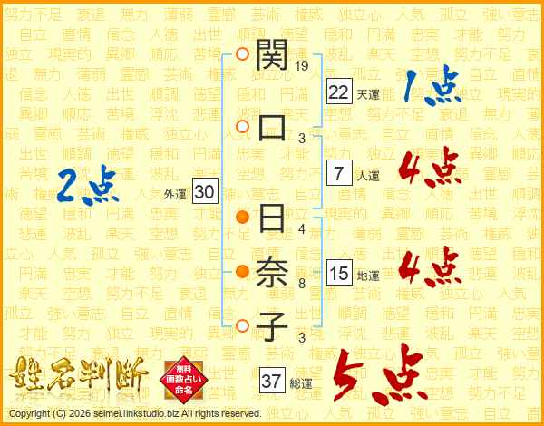 関(19画)口(3画) 日(4画)奈(8画)子(3画)