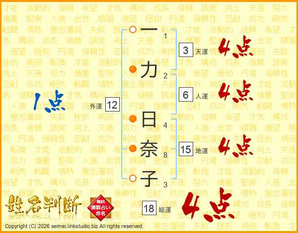 一(1画)力(2画) 日(4画)奈(8画)子(3画)