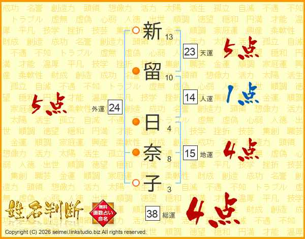 新(13画)留(10画) 日(4画)奈(8画)子(3画)