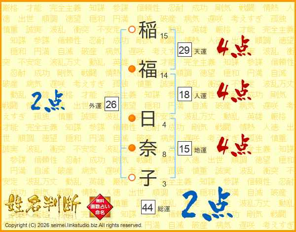 稲(15画)福(14画) 日(4画)奈(8画)子(3画)