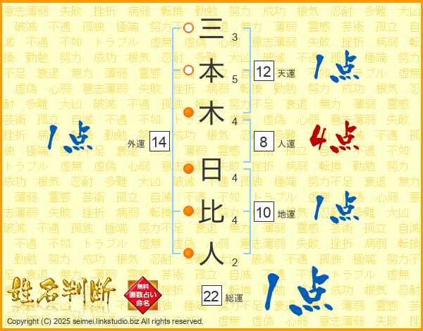 生活面を象徴する運勢です。外部から受ける影響力を表し、結婚運、家庭運や職場、環境への順応性を表します。総運から人運を引いた画数。姓や名が1文字の場合を除く。